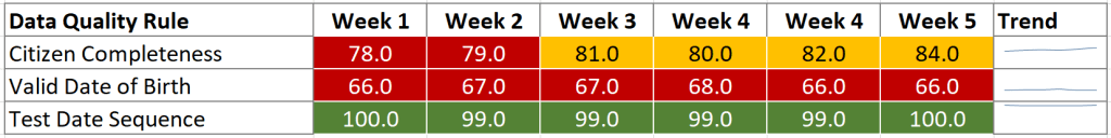 Data Quality Metrics are then published on scorecards or reports. These would typically look like the screen shot below. In this example the table displays a new row for each Data Quality rule and for each rule the DQ Metric on a weekly basis.