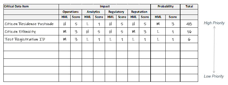 For each perspective a simple high, medium, low scoring mechanism can be used to quantify the impact of poor data quality.