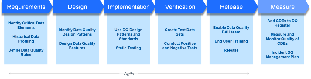 The diagram below highlights key activities at the different stages of an SDLC where Data Quality work takes place. These include understanding the need for data quality in requirements phase through designing solutions that provide required data validation followed by standard testing and release. As with most cases method can be delivered as part of an agile delivery. The first task is to identify Critical Data Elements which is covered in next section.